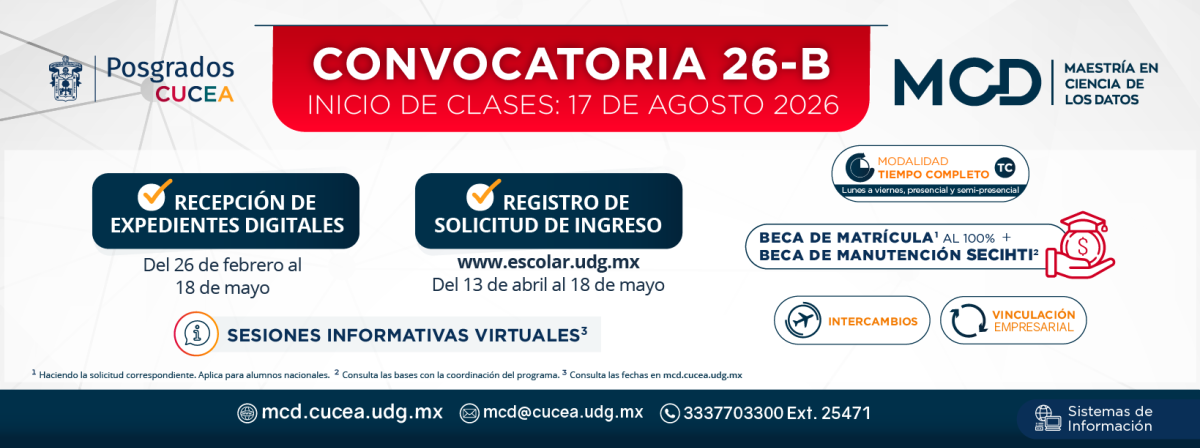 La MCD, CUCEA, es un programa estructurado para el ingreso de profesionistas en diferentes disciplinas con conocimientos sólidos en la extracción, gestión y analítica de datos que coadyuven a la solución de problemáticas de diferente índole. Descargar convocatoria